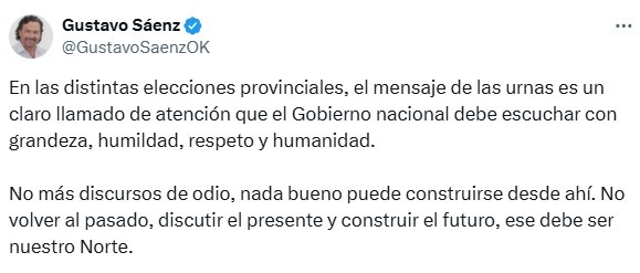 En su mensaje, afirmó: "En las distintas elecciones provinciales, el mensaje de las urnas es un claro llamado de atención que el Gobierno nacional debe escuchar con grandeza, humildad, respeto y humanidad. No más discursos de odio, nada bueno puede construirse desde ahí. No volver al pasado, discutir el presente y construir el futuro, ese debe ser nuestro Norte".